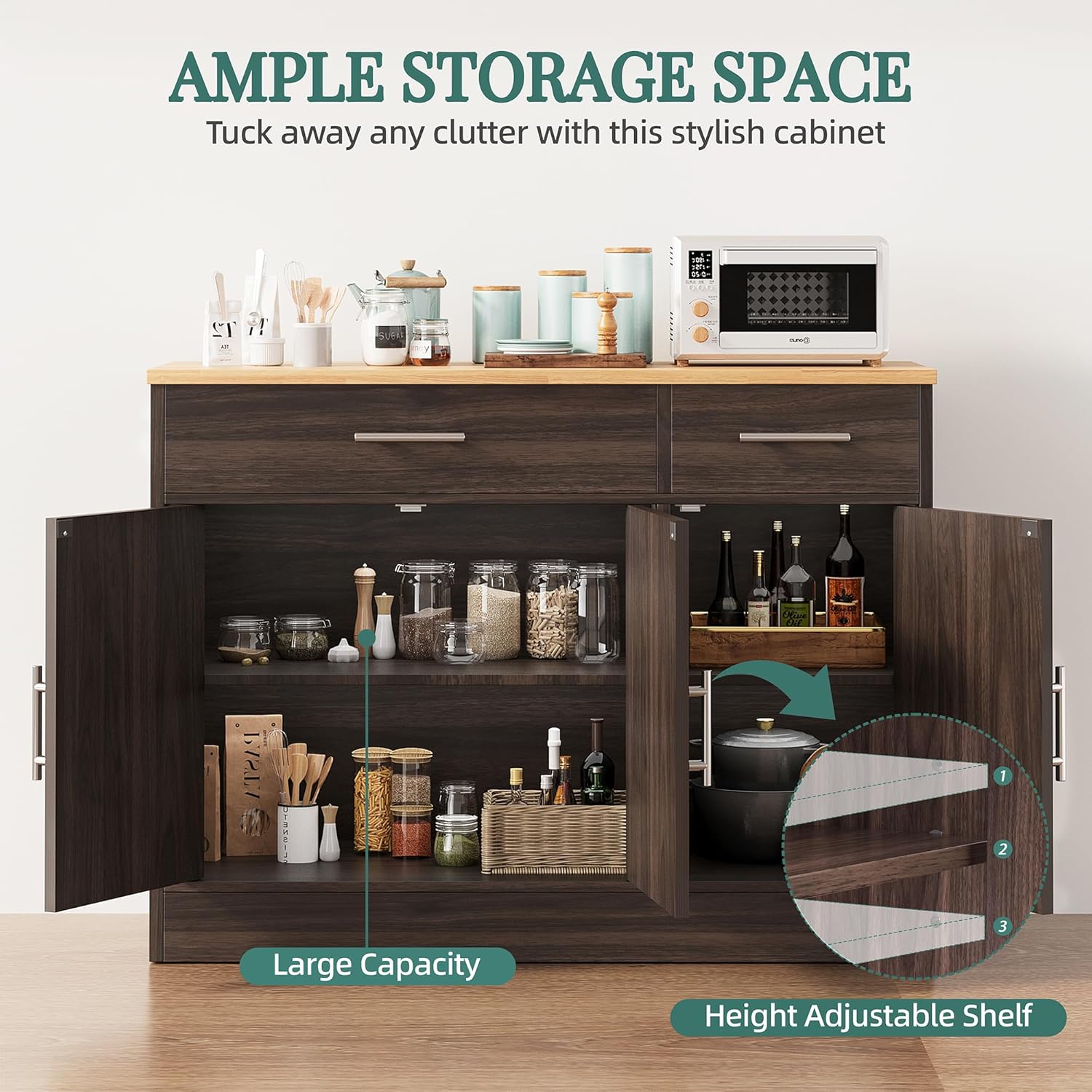 - Large Storage Space Cabinet: The buffet cabinet incorporates both open and closed storage space to meet your different needs. Spacious tabletop can place items for easy access, three handy drawers help classify knives and forks neatly, while two bottom cabinets each with internal shelf offer smart space to accommodate mugs, extra dishware, and other essentials.