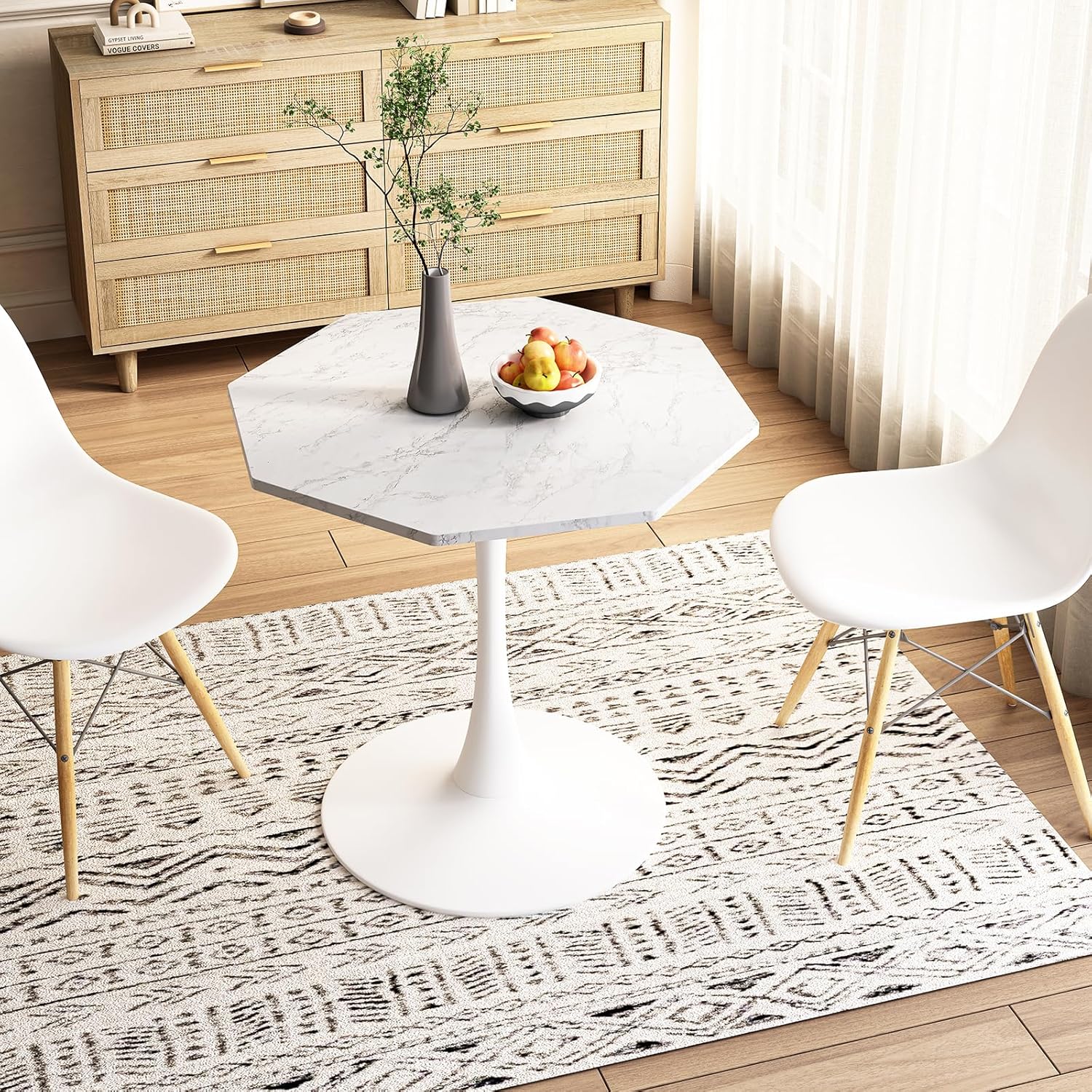 31.5 in Hexagonal Pedestal Dining Table for 2, Small Tulip Bistro Table with Metal Base, Space Saving Breakfast Nook Furniture for Home Cafe Apartment, Marble White