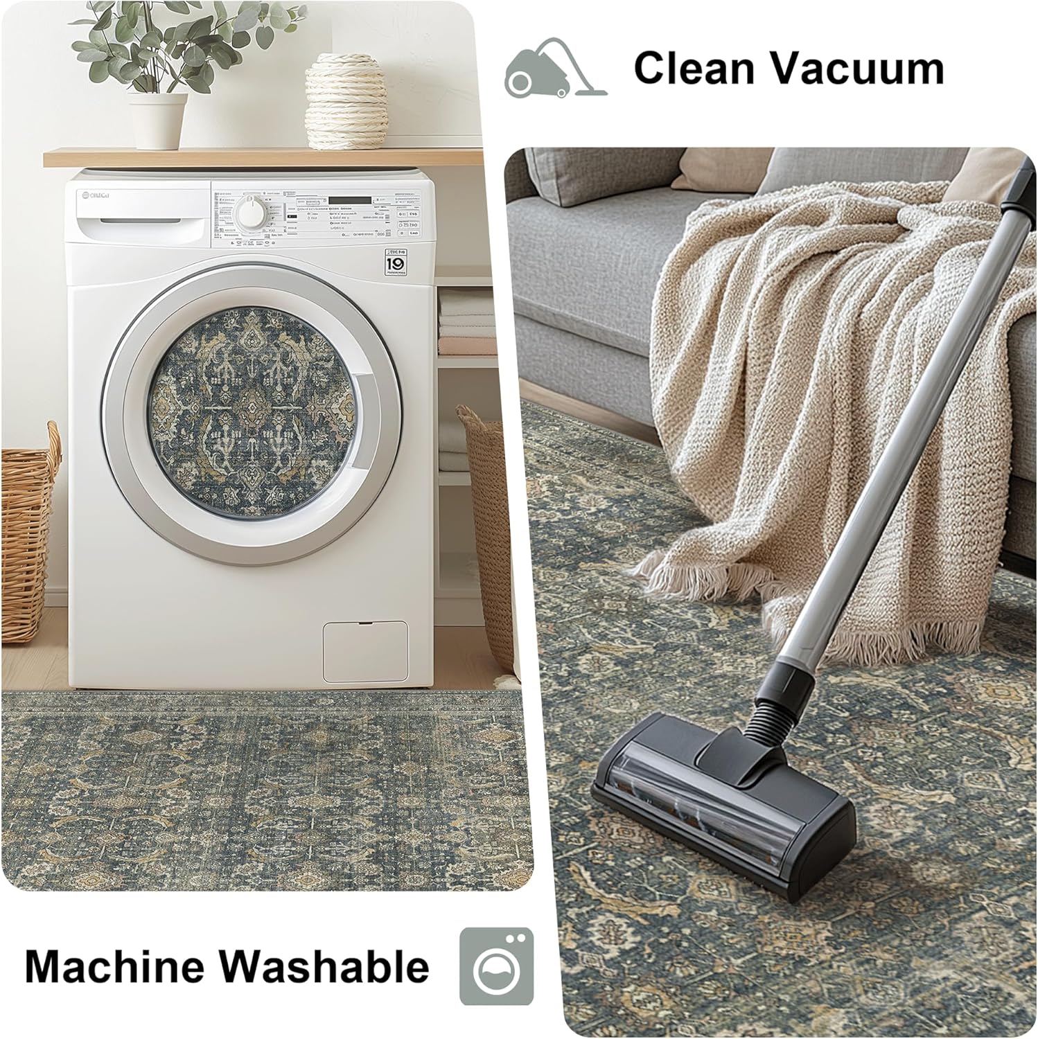 2X7 Area Rugs Machine Washable Rugs for Living Room, Vintage Boho Large Rugs for Bedroom Dining Room, Non Slip Indoor Soft Distressed Lightweight Thin Low Pile Carpet, Deep