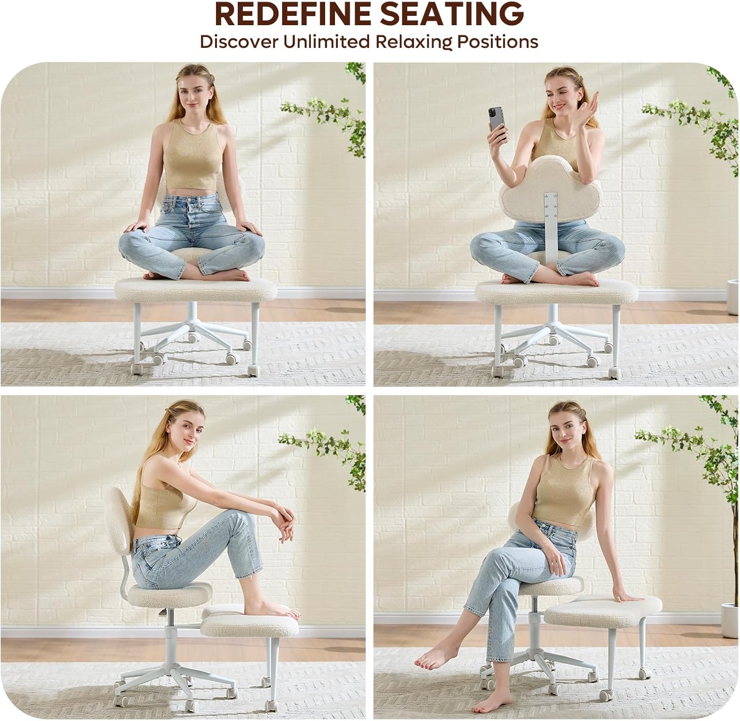 Cross Legged Office Chair with Wheels, Meditation Chair, ADHD Chair for Adults, Wider Height Adjustable Backrest and Seat, Yoga Office Chair, Teddy Fabric, Off White